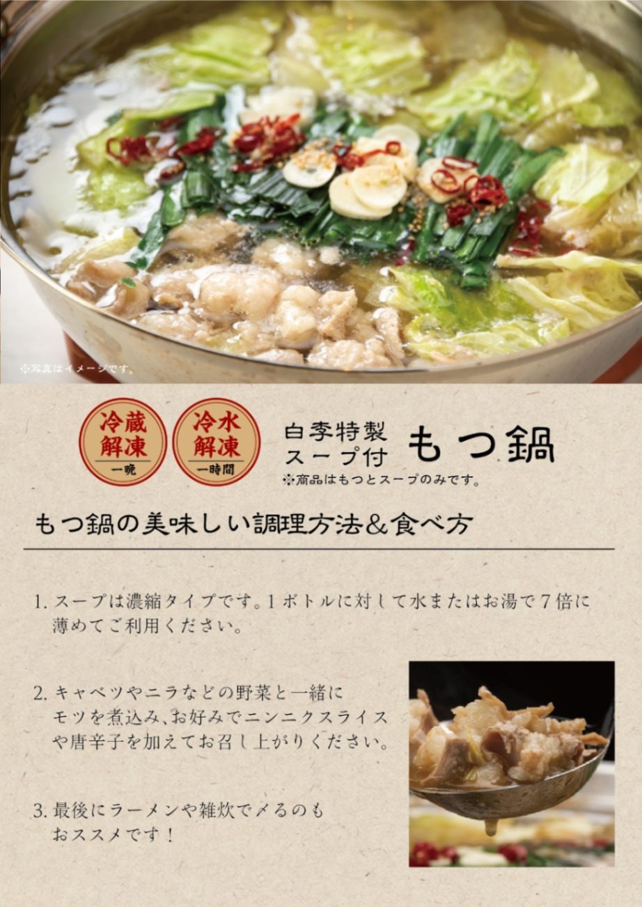 特製もつ鍋スープ(濃縮タイプ)、ニンニクスライス、鷹の爪、乾麺をお付けしてお届け致します。