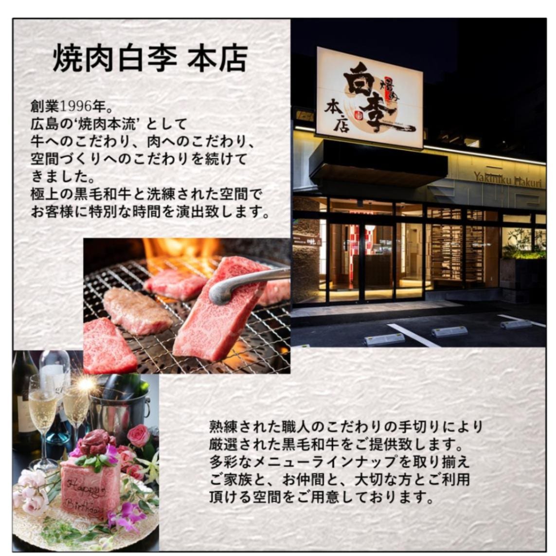 牛へのこだわり、肉へのこだわり、空間づくりへのこだわりを続けて、長年歩んできた「白李グループ」だからこそ提供できる「肉の美味しさ」「焼肉店としての楽しさ」を精一杯のおもてなしと一緒にお客様に味わっていただきたい。
